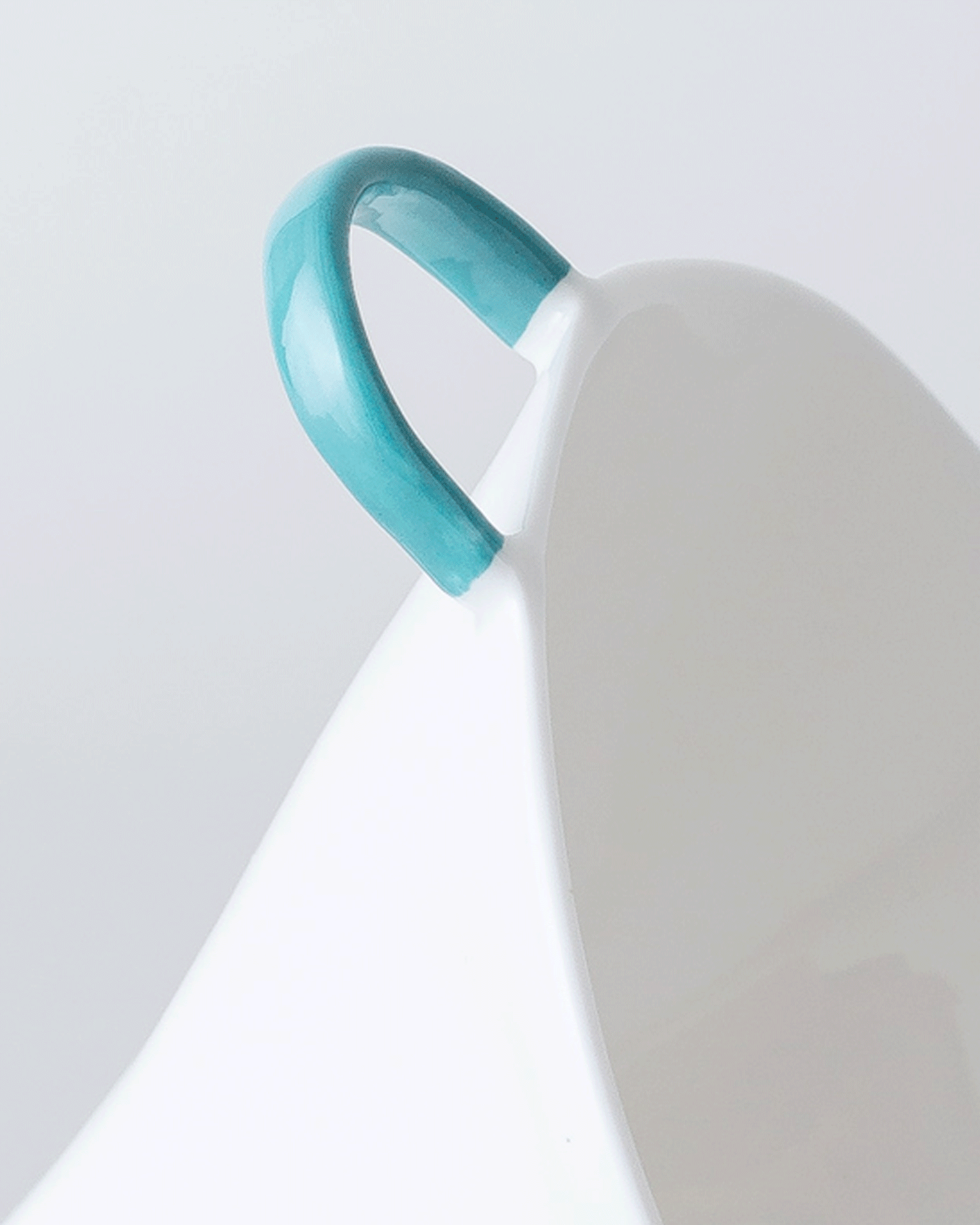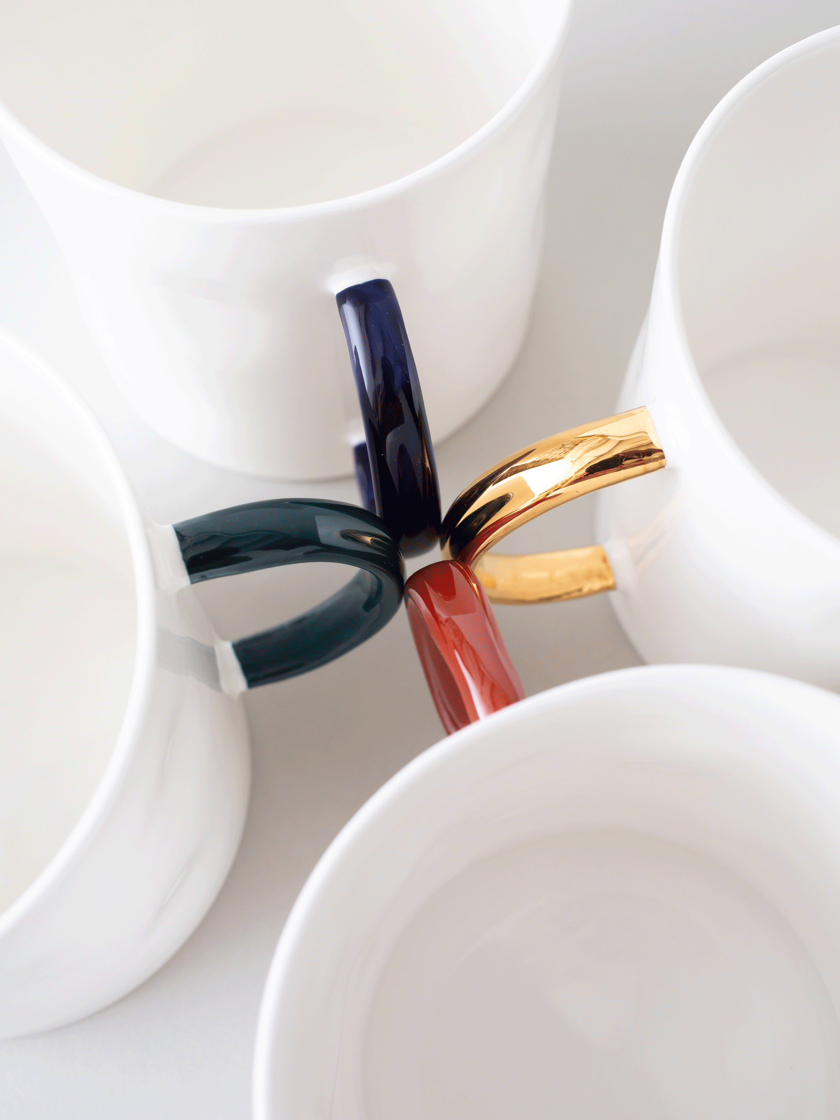 Tea is very important to us. As such our tea mug had to be the perfect size: not too big, allowing the tea to get cold too quickly, not too small - nobody wants a tiny cup of tea. With an elegant but sturdy handle to enable it to be drunk steaming hot. Handmade from fine bone china, with a clear glaze bringing out the crisp white of the china and emphasising the dimpled profile of the mug. The undulating, tactile surface of the mug helps it to sit happily in the hand and each one has a hand-painted handle. You can also find sets of four tea mugs here.