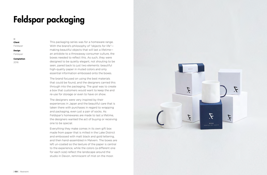 She writes of our boxes: “with the brand’s philosophy ‘objects for life’ - making beautiful objects that will last a lifetime - an antidote to a throwaway consumer culture, the boxes needed to reflect this. As such, they were designed to be quietly elegant, not shouting to be seen, pared back to just two elements: beautiful high-quality paper in a muted colour and only essential information embossed on the boxes”